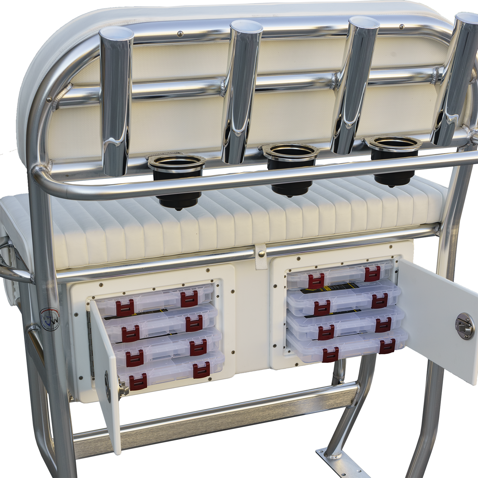 - 2 latched and sealed under-seat cabinets, bottom opening and holding 8 Plano® 3600 Series, big tackle boxes, measuring 11 x 7.25 x 1.75 inches, on both sides, plus a Yeti® bottle opener affixed on the right side (not shown in pictures), included in the price.