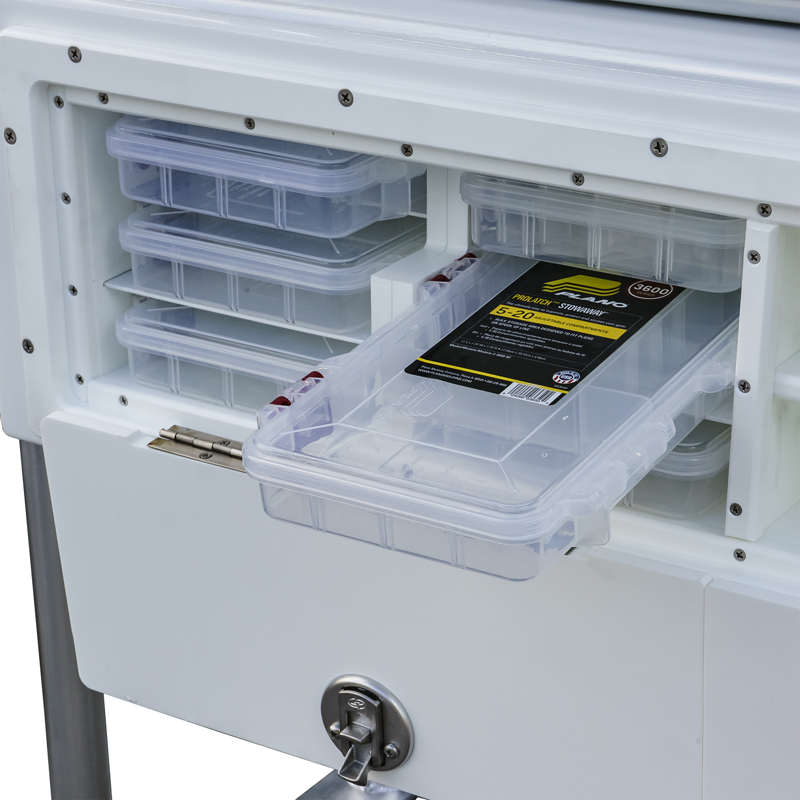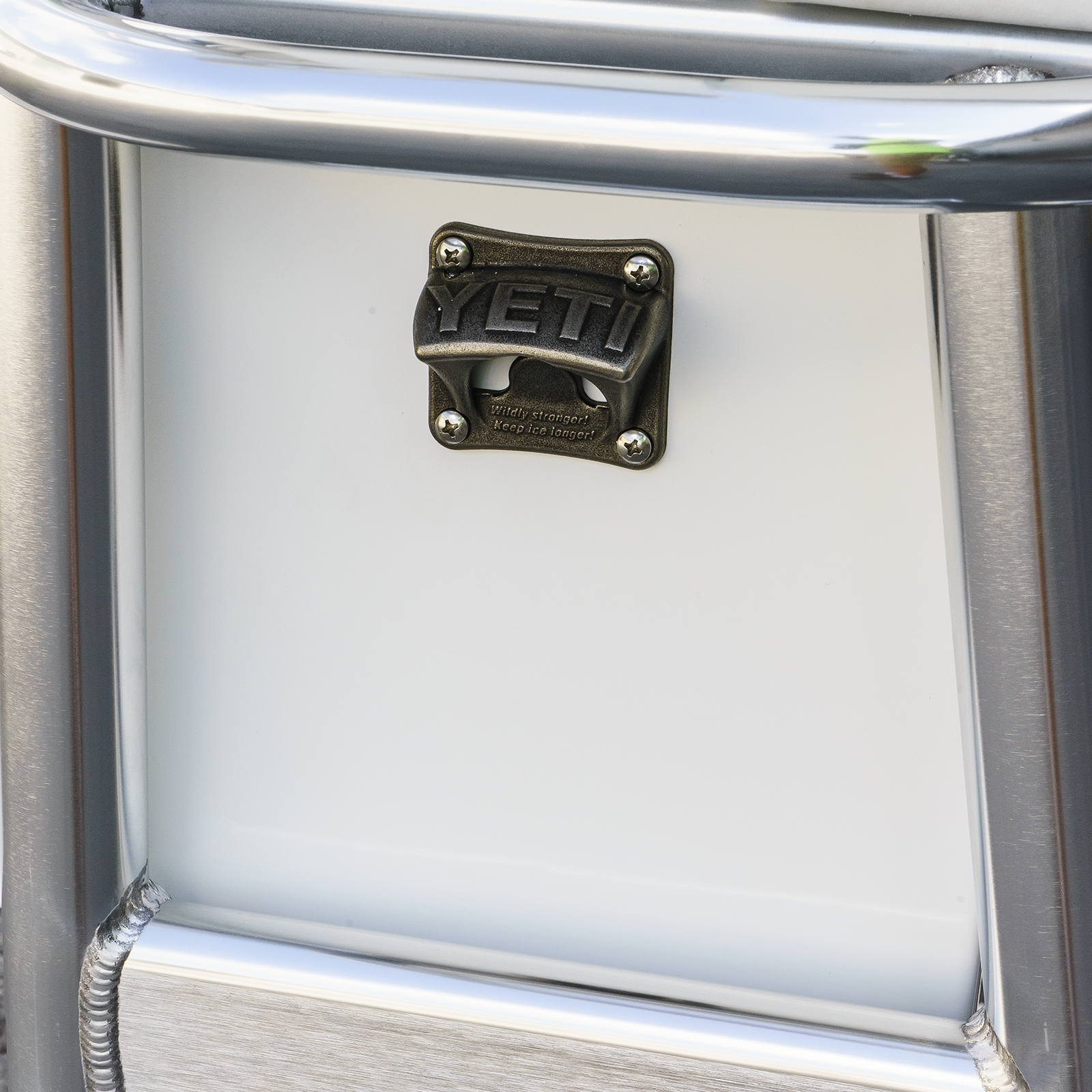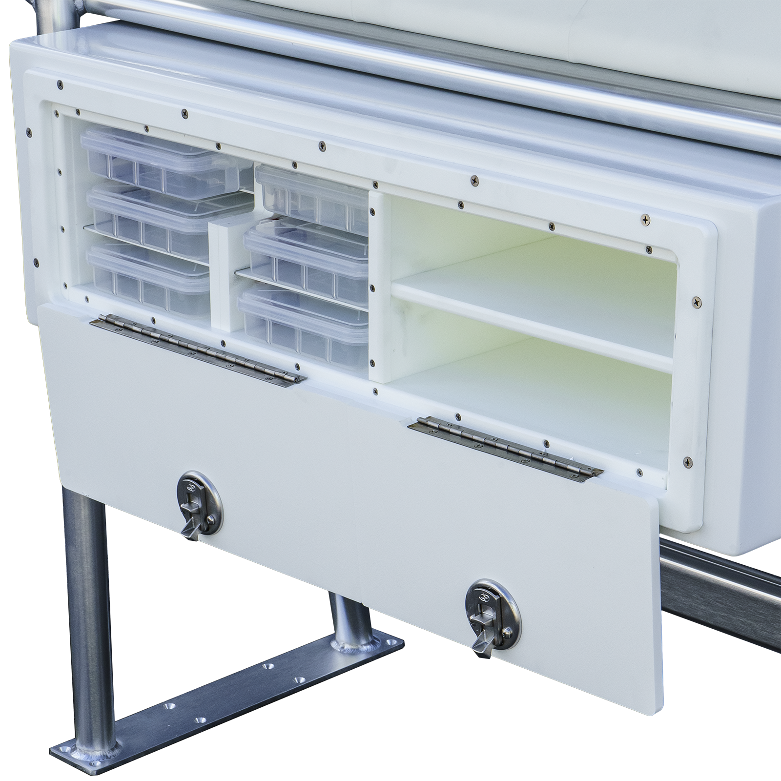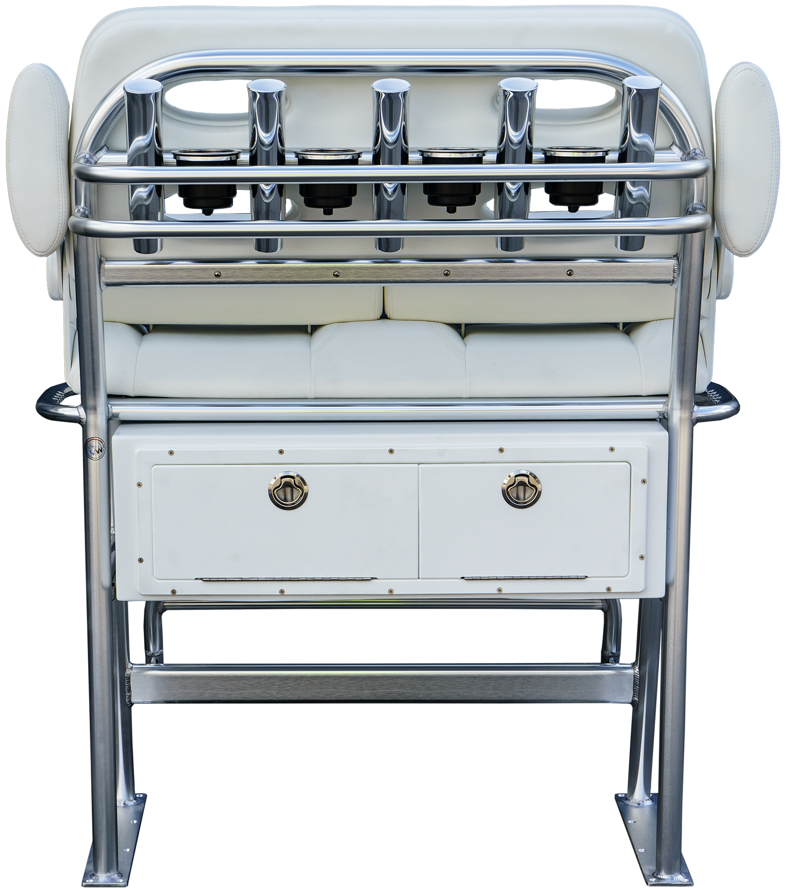 We mated Llebroc’s® Billfish convertible bolster bench seat on top of a purpose-made, super sturdy, bright finish marine spec anodized 1 - 1/2 inch diameter, schedule 40 TIG fillet welded 6061-T6 aluminum structure housing 6 big, 3600 Series Plano® tackle boxes on one side and 2 separate storage spaces on the back, all latched and hermetically closed, plus room for a Yeti® Tundra 65 on the bottom and a side-mounted Yeti® bottle opener.