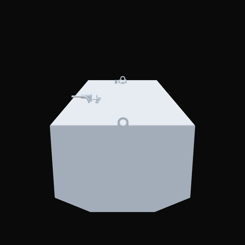 Black rectangular marine fuel tank with flat top and angled front bottom corners. The tank has a welded lifting eye in the center front, fittings including white and black pipes with blue caps on the top left, and a label mounted near the center back. The surface shows texture and welding marks. The background is transparent