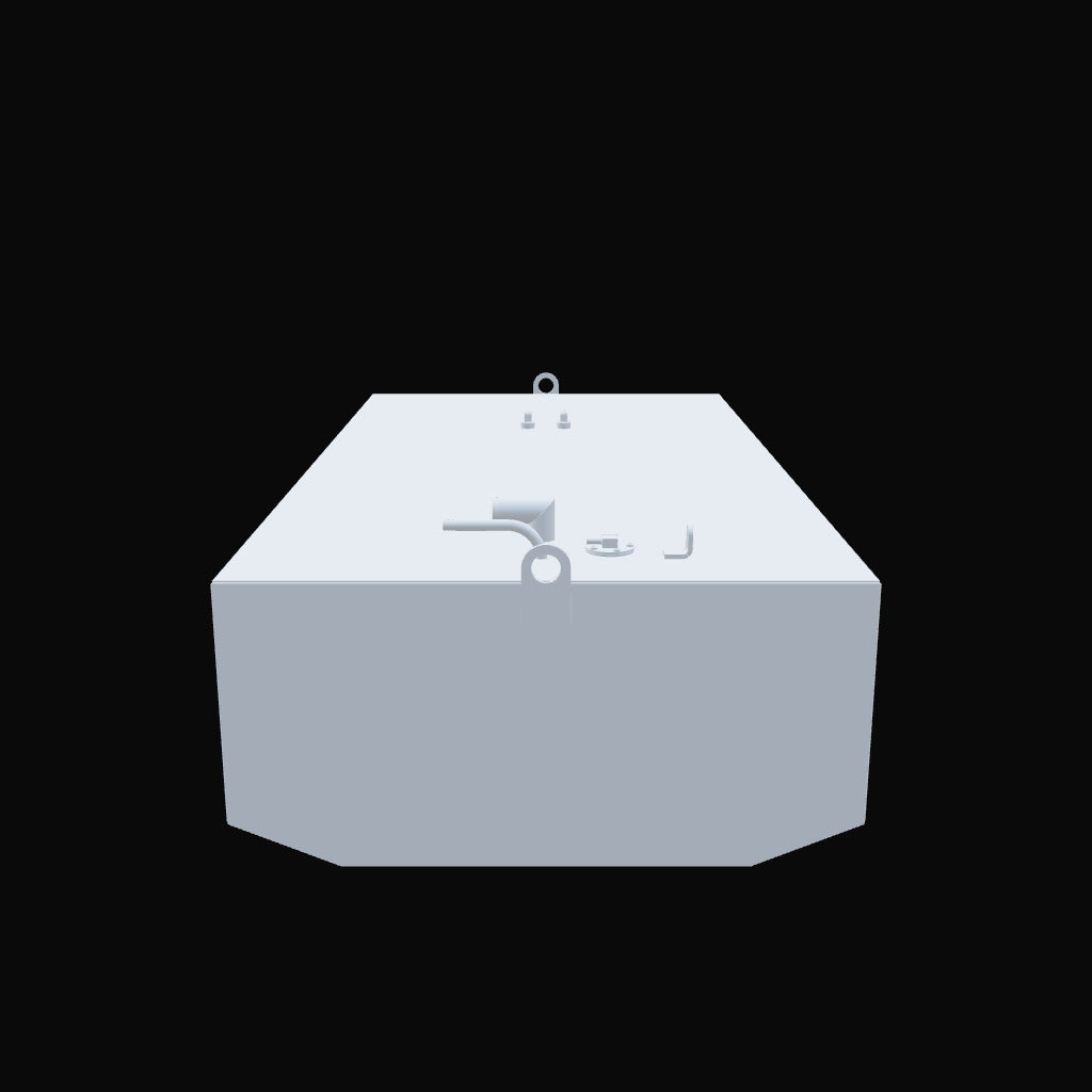 Bottom angle view of a black marine fuel tank with a beveled base and a welded lifting tab visible on the side