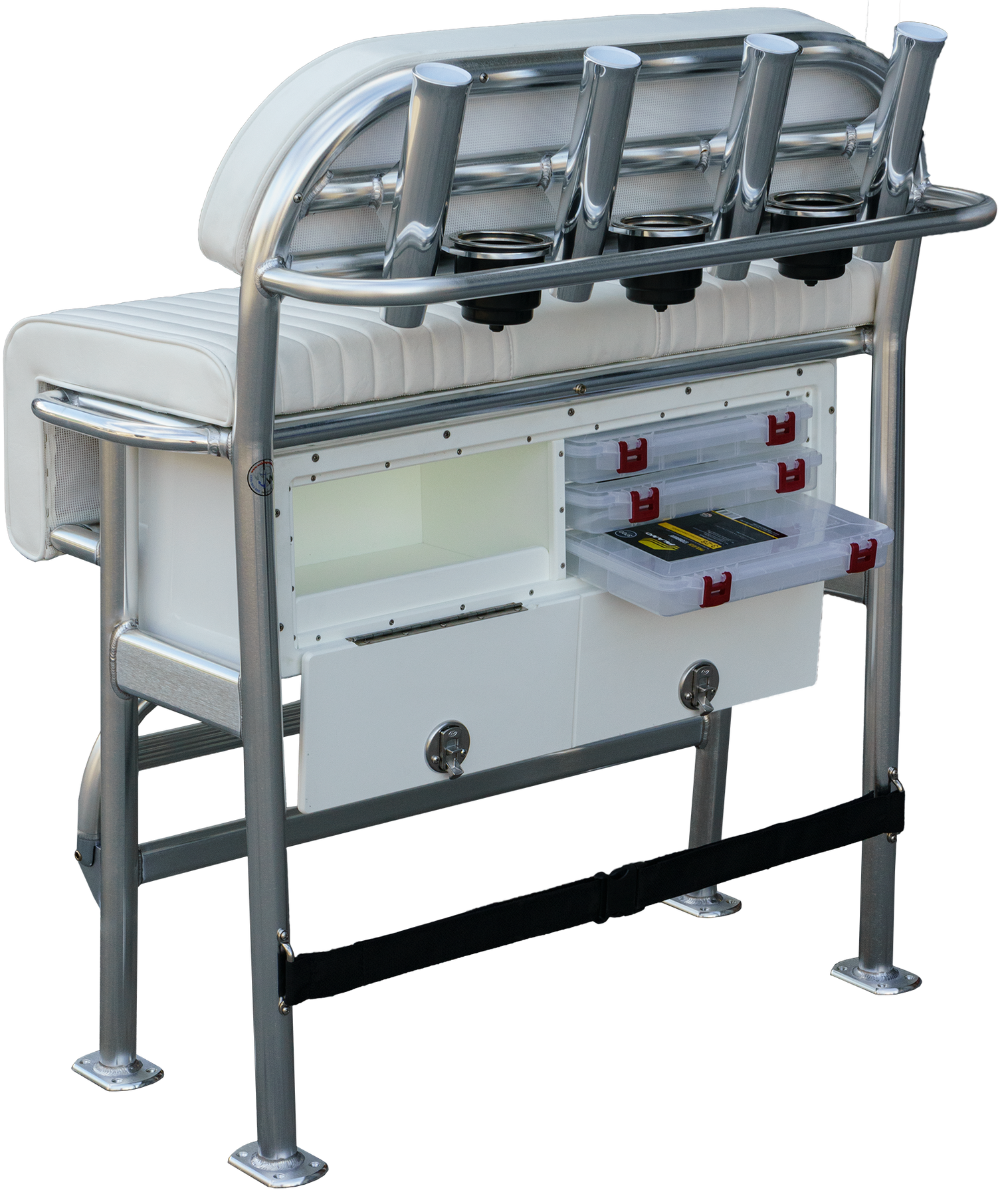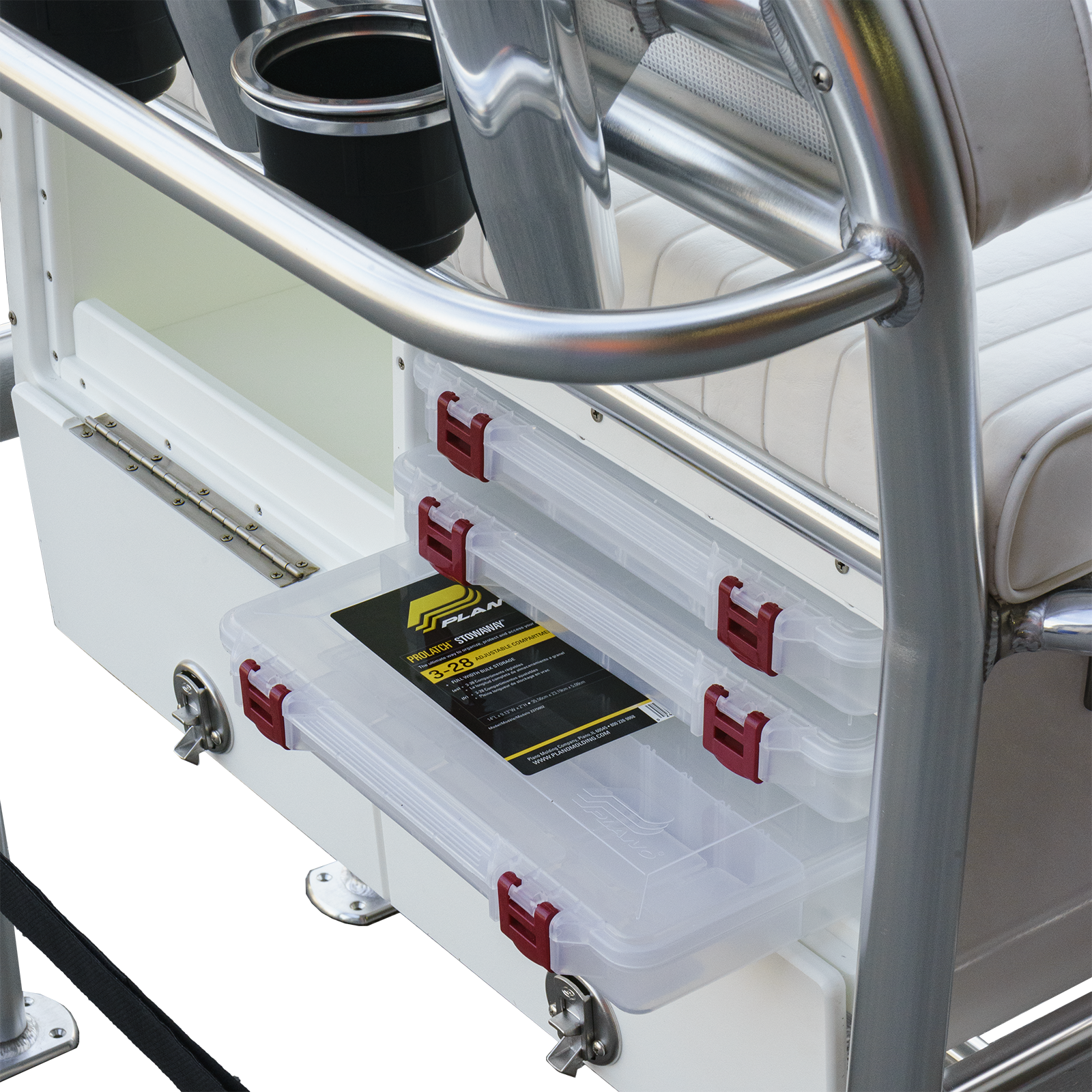 - 2 latched and sealed under-seat cabinets, bottom opening and holding 3 Plano® 3700 Series, big tackle boxes, measuring 14 x 9 x 3 inches, on one side and a spacious, open storage space on the other, plus a Yeti® bottle opener affixed on the left side, included in the price.