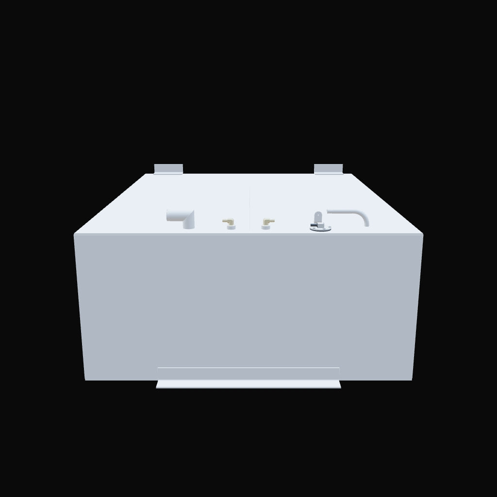 A black, rectangular fuel tank with a textured surface, featuring various fittings on its top, including what appears to be a hose connection, and two flat mounting brackets on opposite edges of the top surface. The bottom corners of the tank are slightly beveled