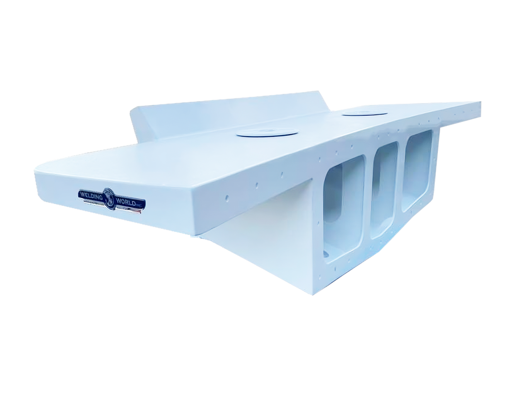 An aerial view of twin Apex flat bottom engine brackets floating on the ocean, with turquoise water and waves