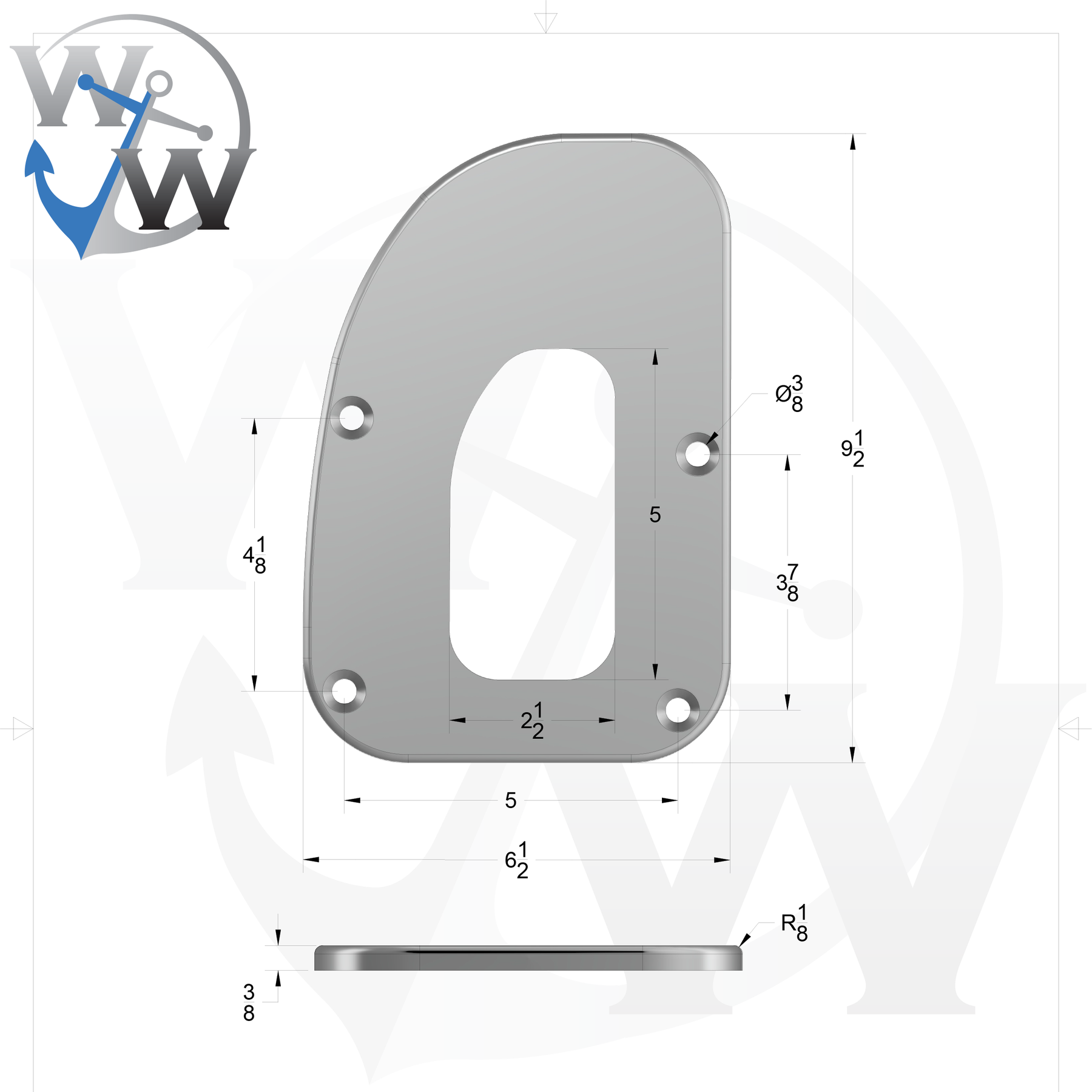 Countured pad to install your D-5 size D-pipe to any surface at almost any angle due to its ample sizing in both height and width. Discrete 3/16" fillet, and countersunk screw holes. Left-hand side.