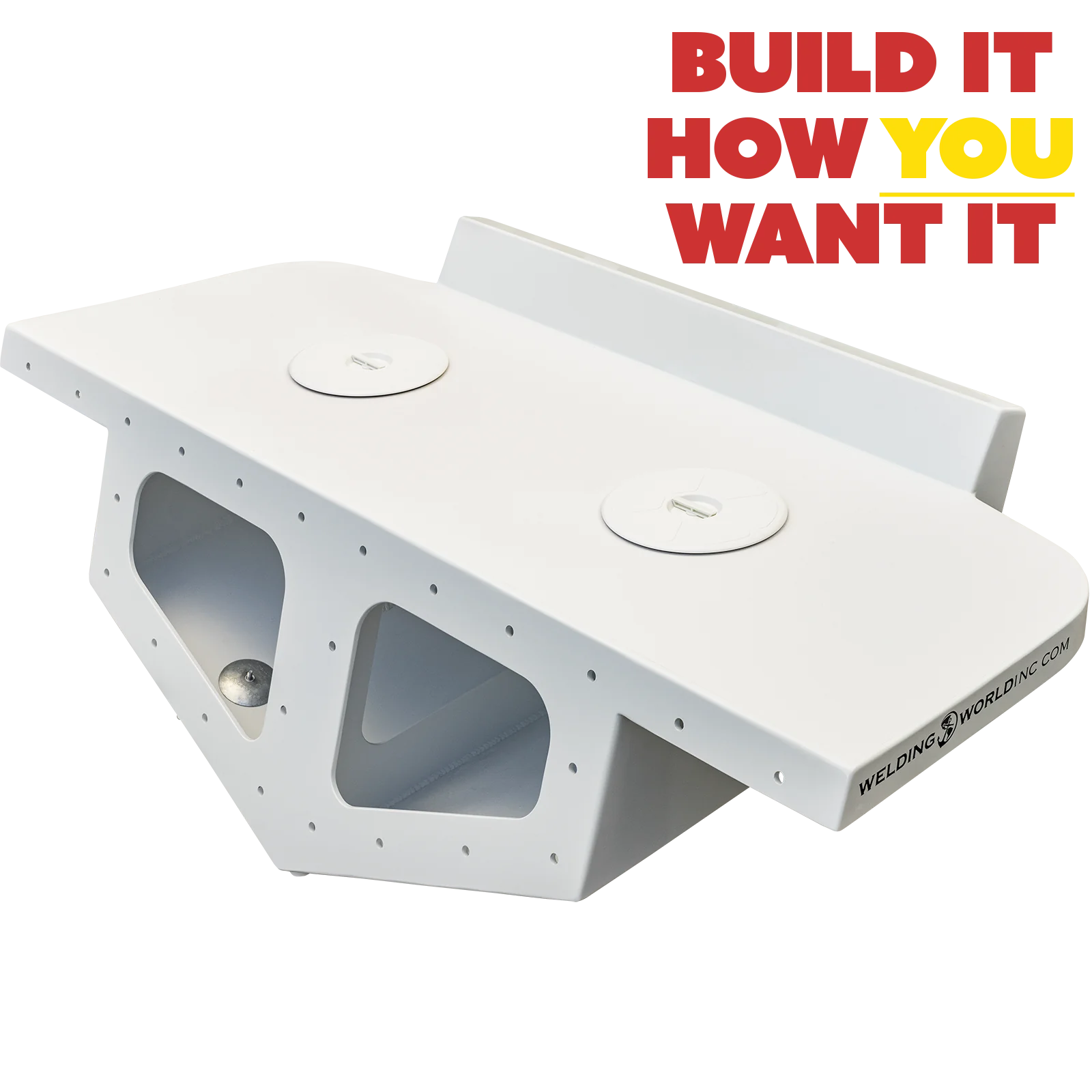 A white, custom high flotation twin outboard engine bracket labeled "Mk.2" with a geometric, angular design. It features multiple mounting holes and cutouts, and has the text "WELDING WORLDWIDE" on the side. The background is a transparent checkerboard pattern, and there is colorful text in the top right corner that says "BUILD IT HOW YOU WANT IT."