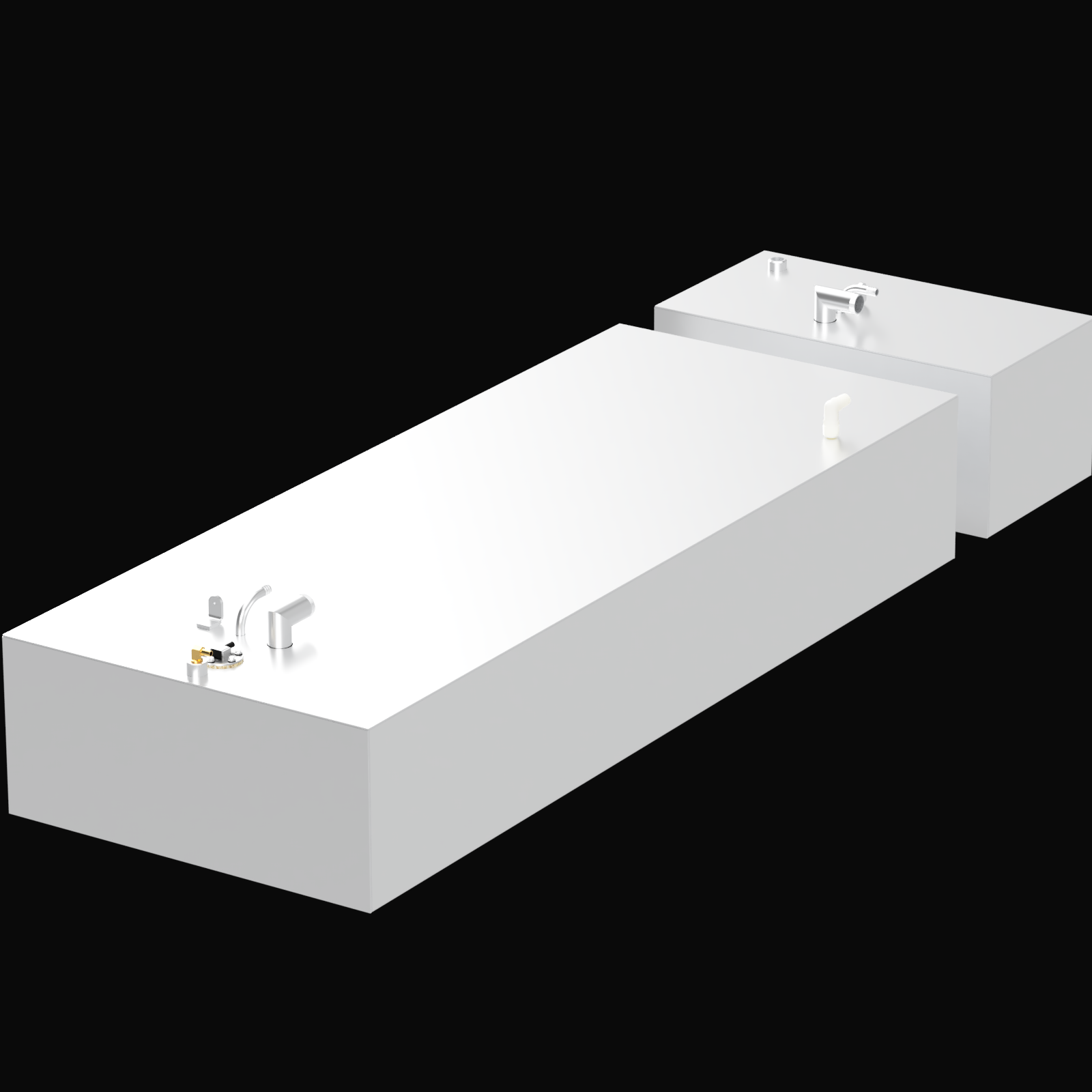 A 3D render of a two-part tank system, showing a large dark grey tank and a smaller one, both with multiple silver-colored and brass-colored fittings on their top surfaces, against a black background.