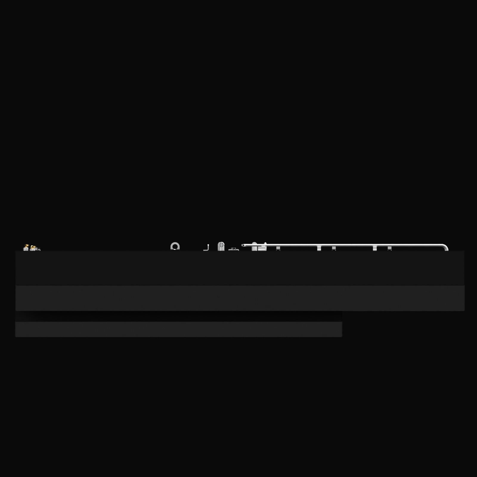 Side view of a large black fuel tank with various metallic fittings and pipes along the top edge. The tank has a rectangular shape with a stepped bottom section, shown against a black background.