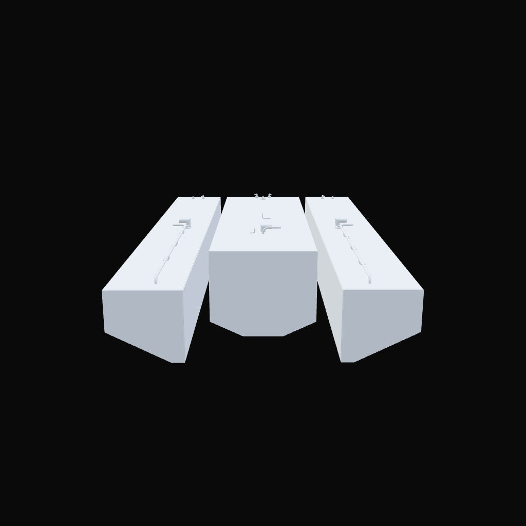 Front view of three black fuel tanks side by side against a black background. The center tank is the largest with an angular front face, and the two side tanks are smaller with angled fronts. Each tank has metallic fittings on the top near the front edge