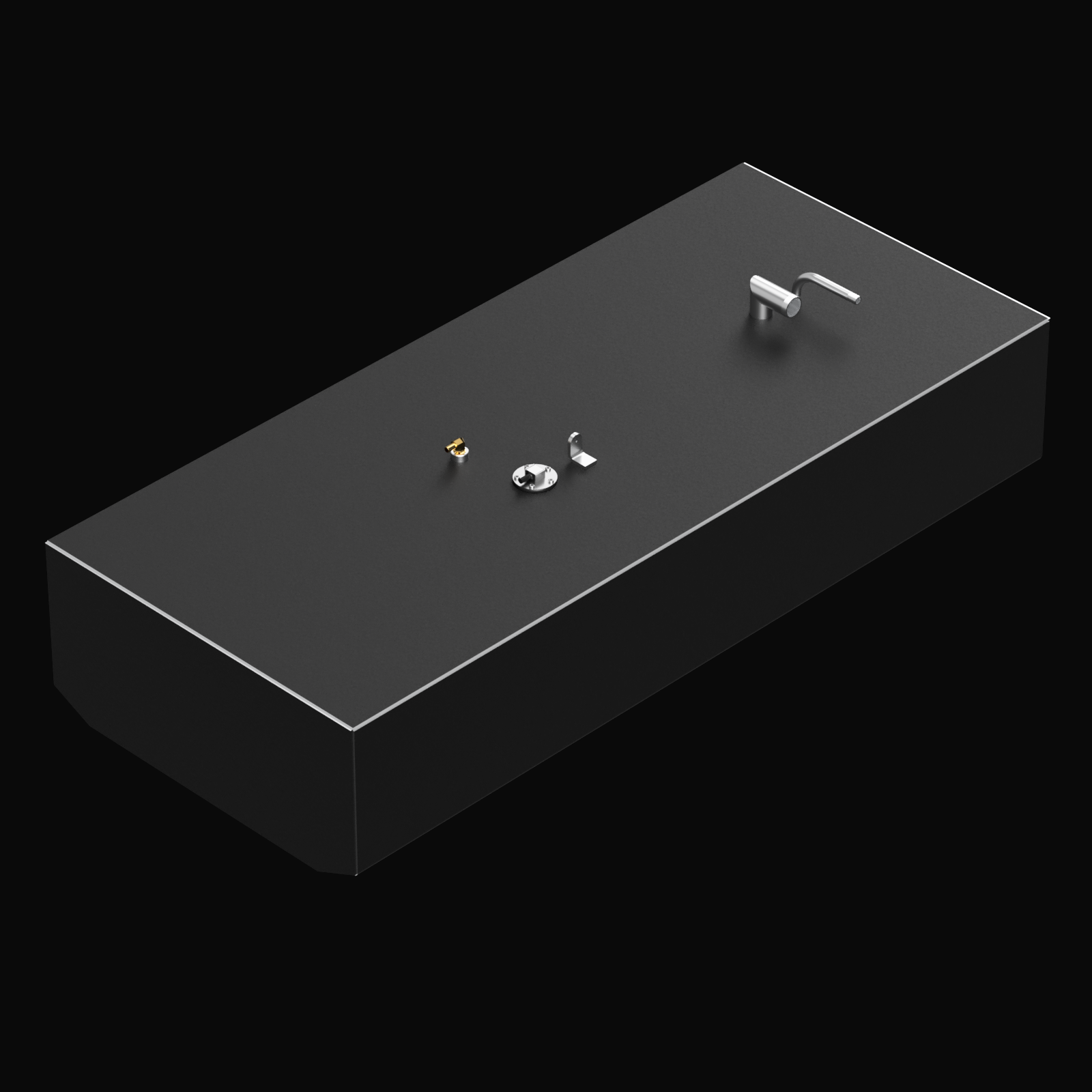 3D rendering of a Grady-White 209 Escape 1999 fuel tank in matte black on a black background, viewed from an angled top perspective showing fittings and mounting brackets on the top surface. The edges are highlighted with a subtle white outline