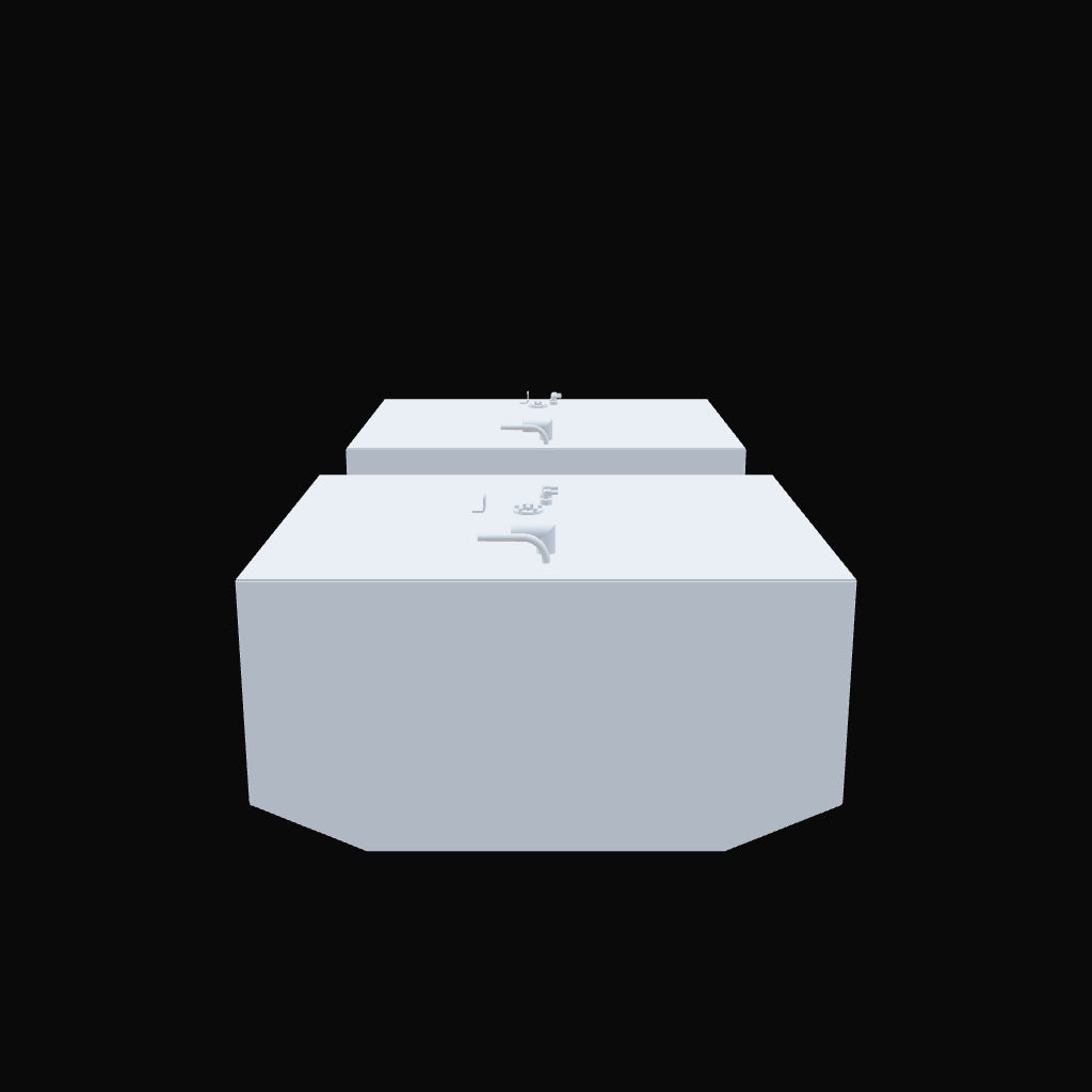 Two rectangular, dark grey fuel tanks, each with various golden and silver-colored fittings on their top surfaces, including pipes and valves. The tanks are viewed from a front-facing, slightly elevated perspective against a black background with subtle white dots. The tank in the foreground has angled bottom corners, while the background tank appears to be a simple rectangular block