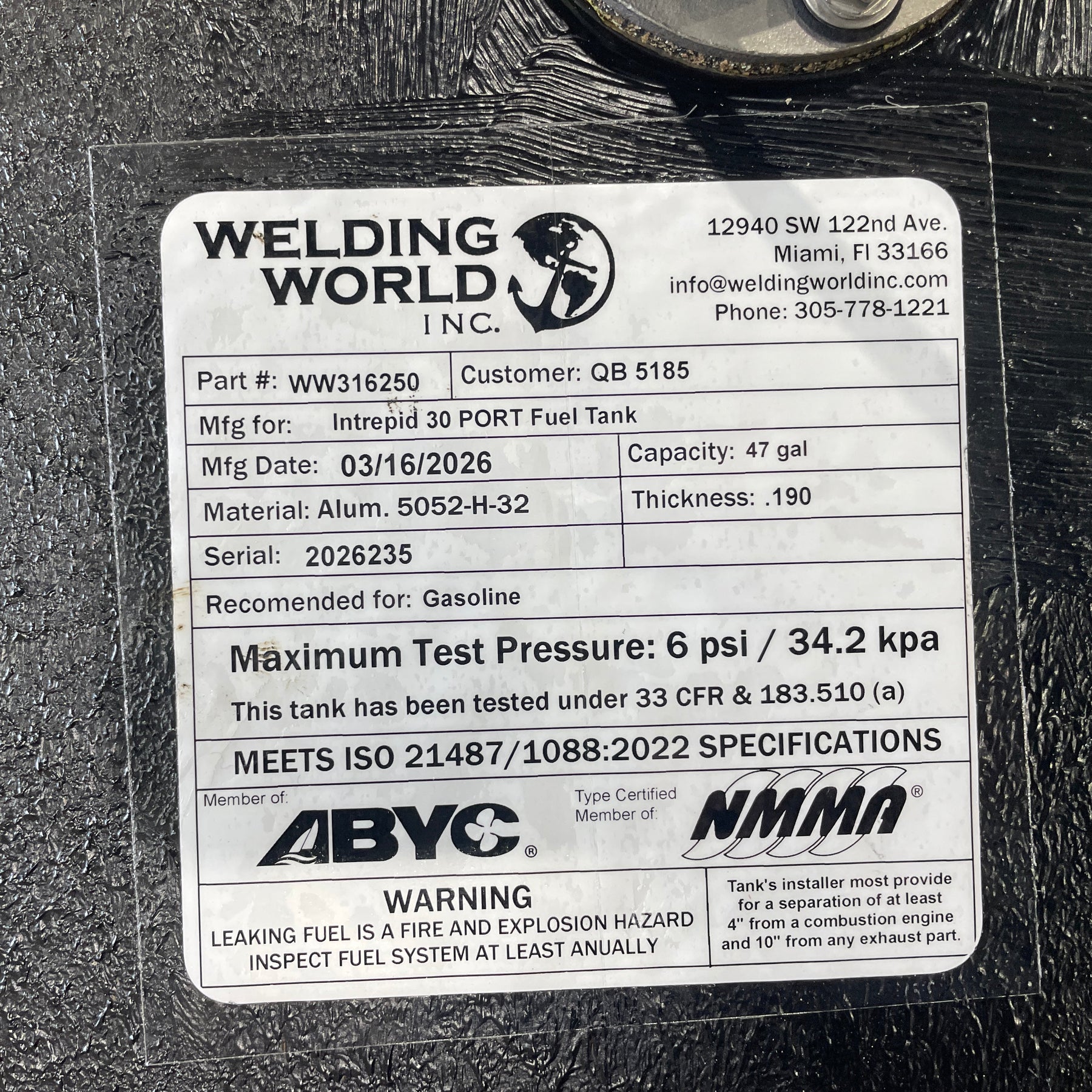 Close-up of an official Welding World Inc. manufacturing label for an Intrepid 30 port fuel tank. The label verifies a 47-gallon capacity, .190" Aluminum 5052-H32 construction, and compliance with USCG 33 CFR & 183.510 (a) and ISO 21487/1088:2022 specifications. Detailed certification markings from ABYC and NMMA guarantee a high-quality, pressure-tested OEM replacement.