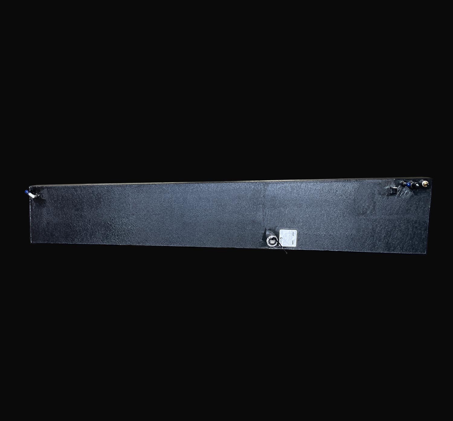 Top-down plan view of a 47-gallon Intrepid 30 (1991) wing fuel tank replacement, showcasing the precision layout of top-mounted fittings and the rugged Coal Tar Epoxy finish. This perspective highlights the long-form geometry and integrated fuel sender, ensuring a guaranteed OEM fit and maximum corrosion resistance for classic offshore Intrepid restorations.
