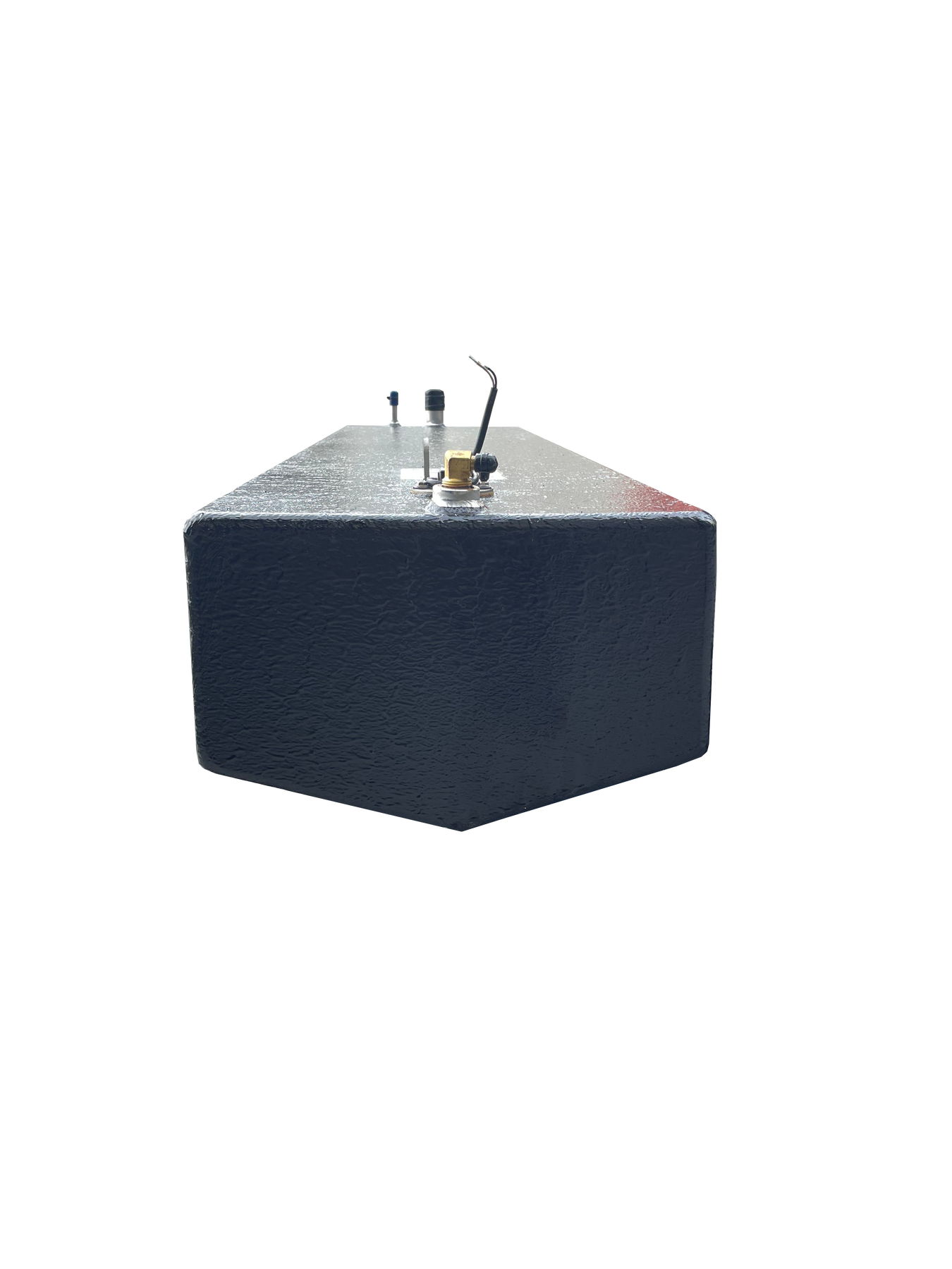 A low-angle photo of a long, wedge-shaped boat fuel tank with a dark, textured finish. The top surface shows various fittings, including a fuel sender and valve connections, against a transparent checkerboard background.