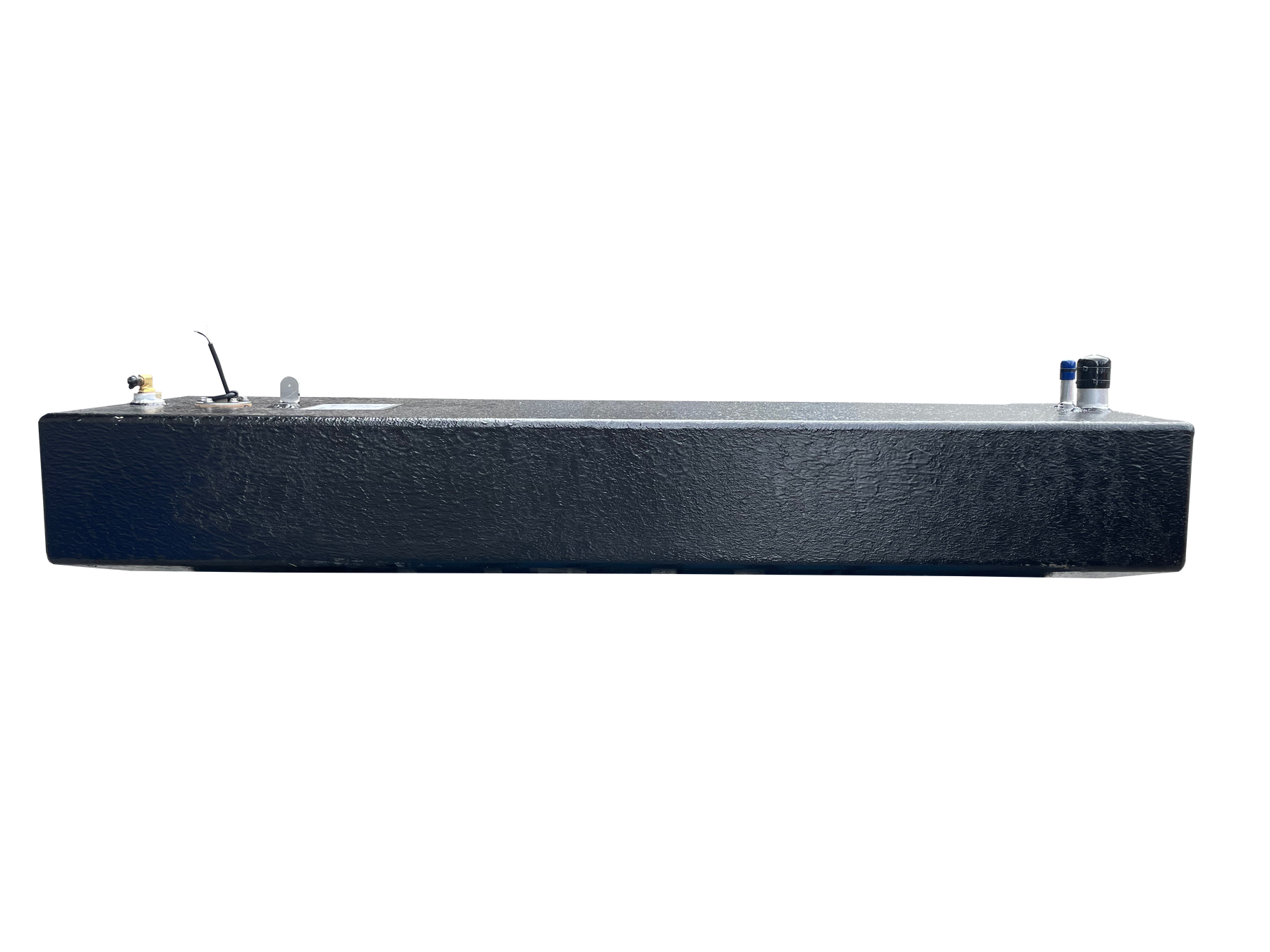 A long side profile photo of a dark, textured boat fuel tank, showing various fittings on its top surface, against a transparent checkerboard background.