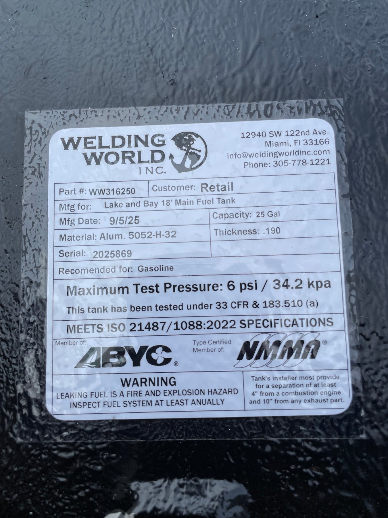 A close-up of a white specification label on a dark textured boat fuel tank. The Welding World Inc. label lists the part as WW316250, manufactured for a "Lake and Bay 18' Main Fuel Tank," with a 25-gallon capacity.