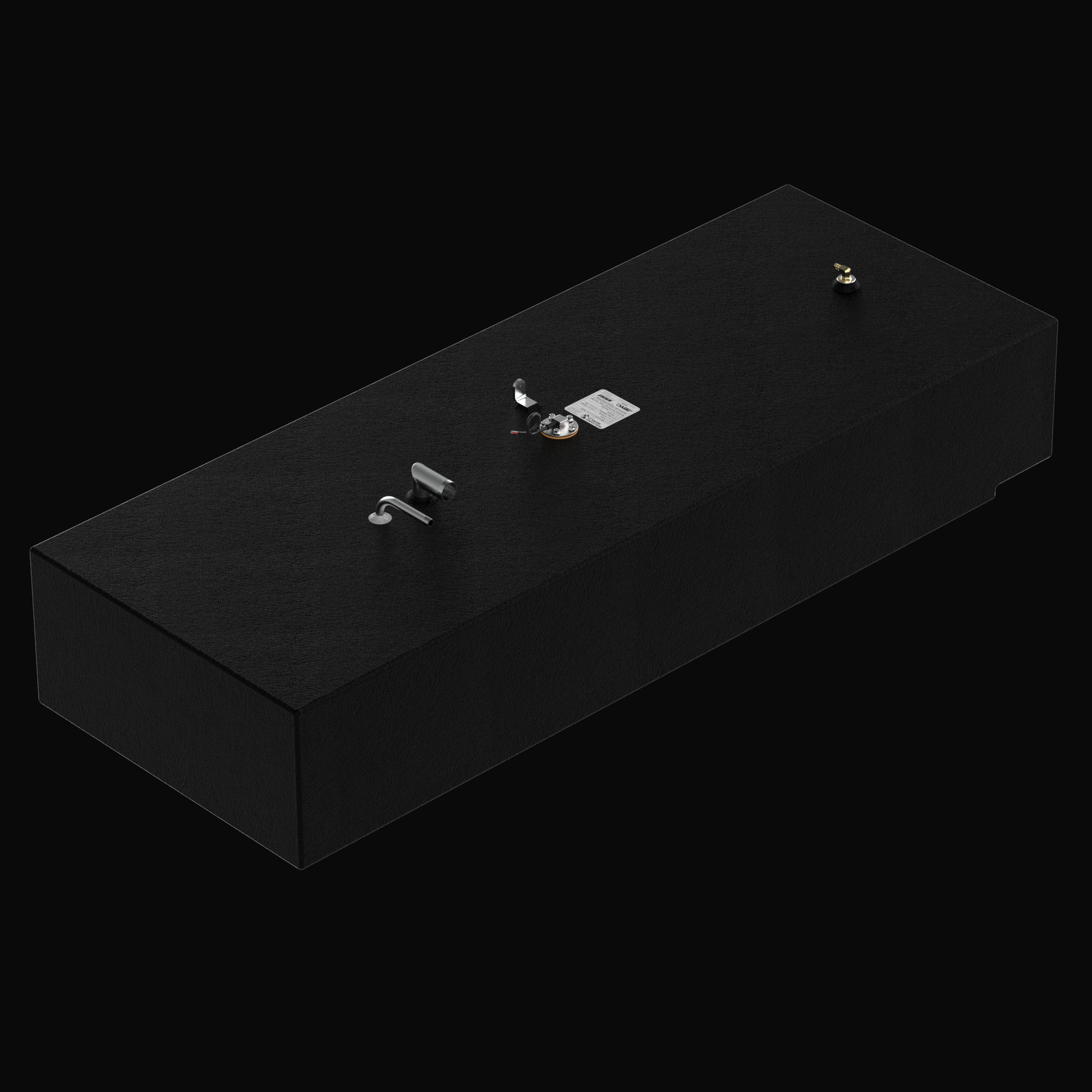 Low-perspective 3D rendering of a matte black marine fuel tank with a textured coal-tar epoxy finish, highlighting a brass fuel vent fitting, stainless steel hardware, and a center-mounted KUS sending unit on a solid black background.