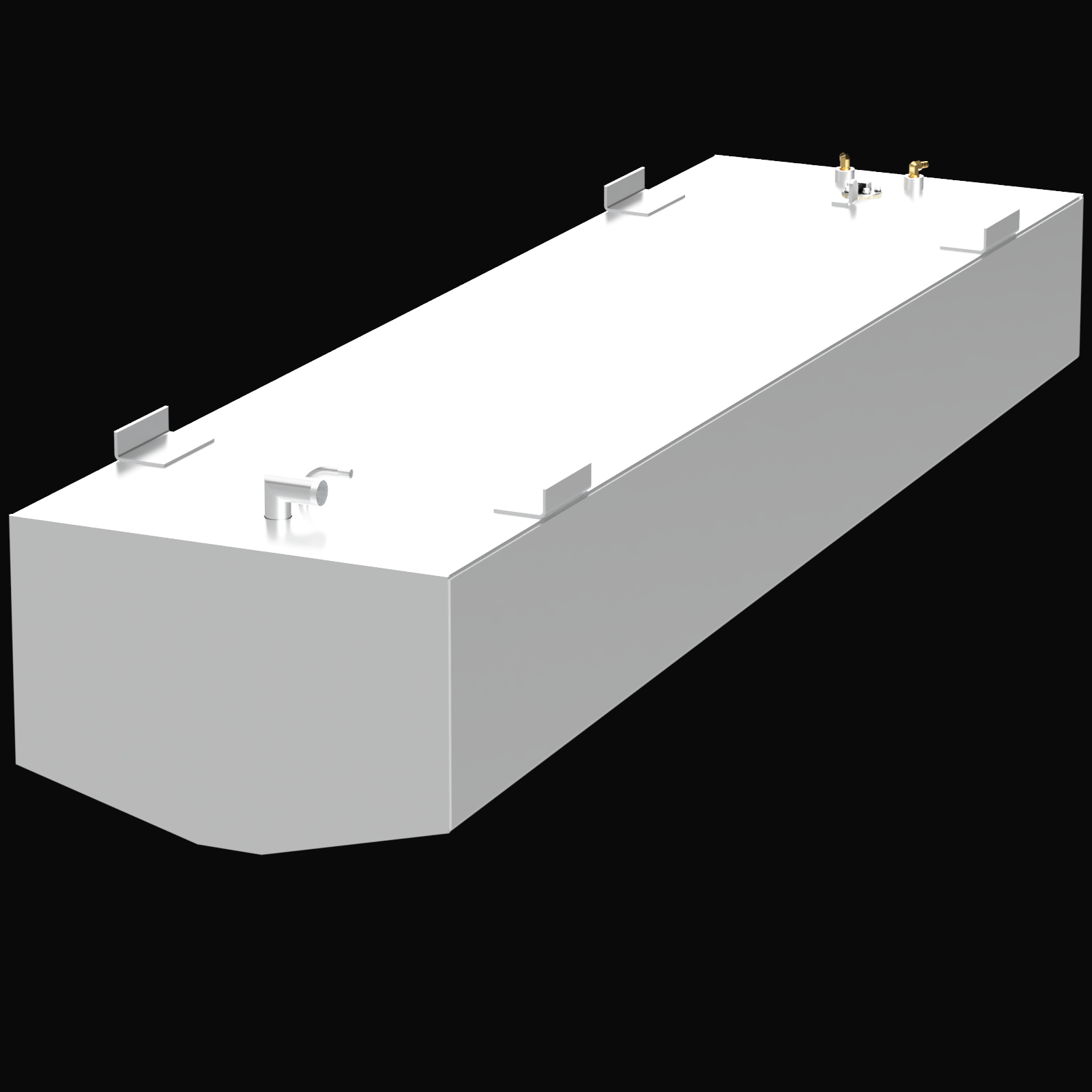 A 3D render of a long, rectangular boat fuel tank with a dark grey body and a highly reflective white top surface. The tank features various fittings (brass and silver) and four black mounting tabs on its top edges, against a black background.