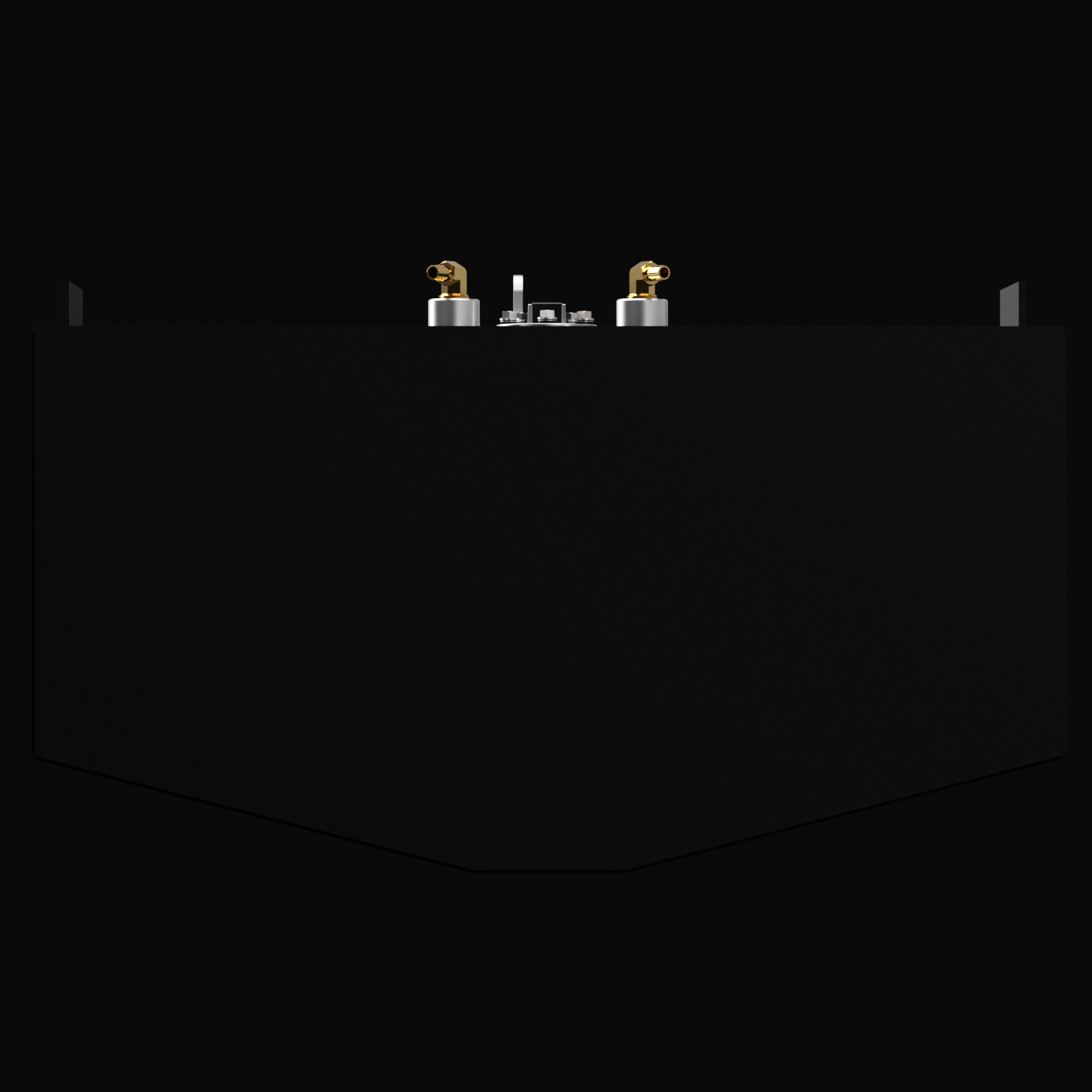 A 3D render showing the profile view of a dark grey boat fuel tank with a V-shaped or faceted bottom. Several brass and silver-colored fittings are visible on the top edge, against a black background.