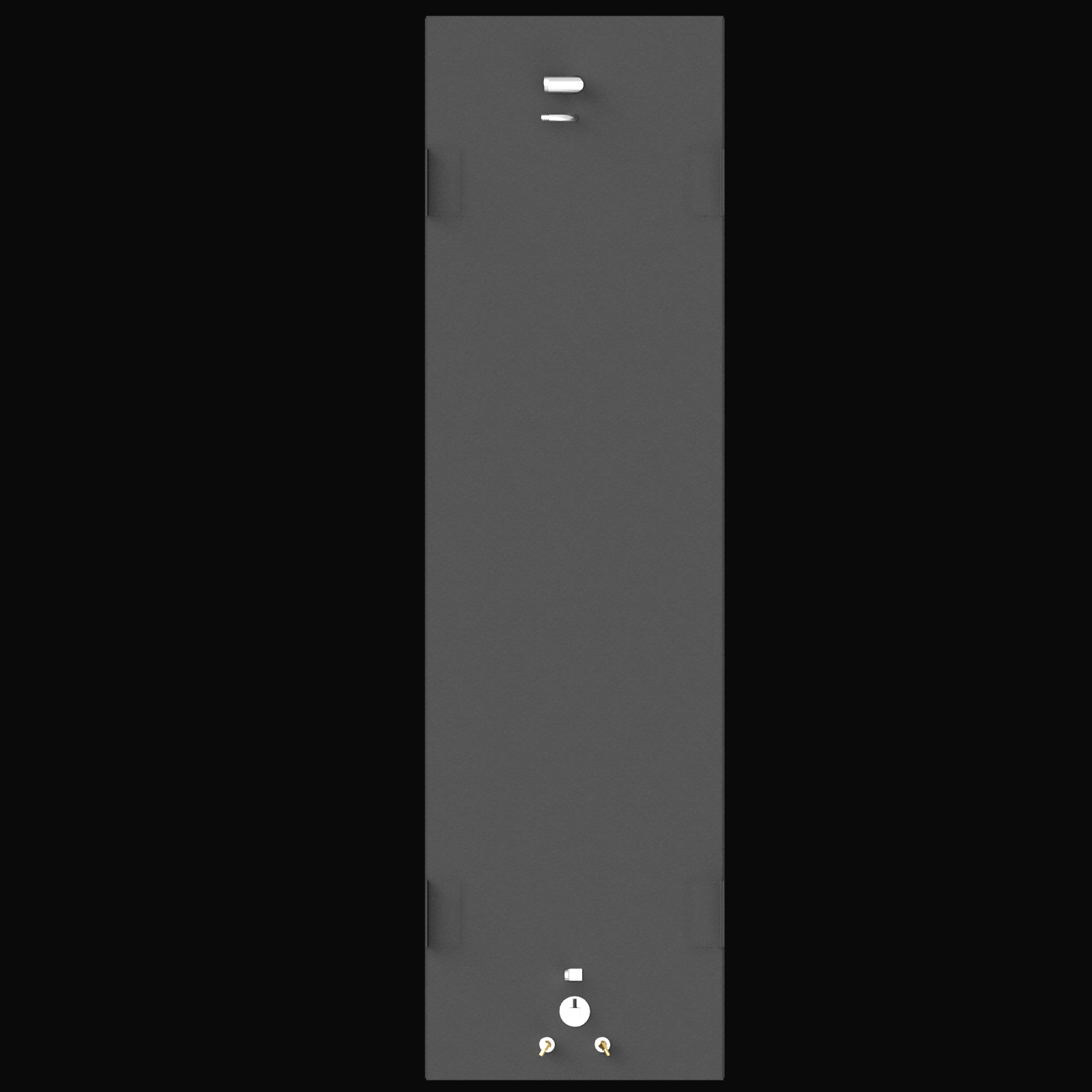 A 3D render of a very long, rectangular boat fuel tank with a dark grey body and reflective white top. The tank features two clusters of fittings and four black mounting tabs on its top surface, shown at an angle against a black background.
