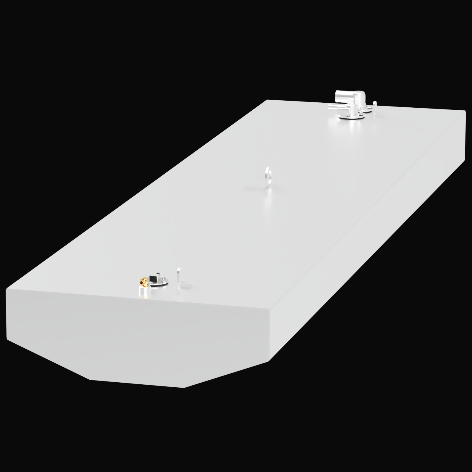 A long, white rectangular fuel tank, viewed from an angle, rendered on a black background. The tank features a large angled cutout on its front edge and has metallic fittings near the front and back of its top surface.
