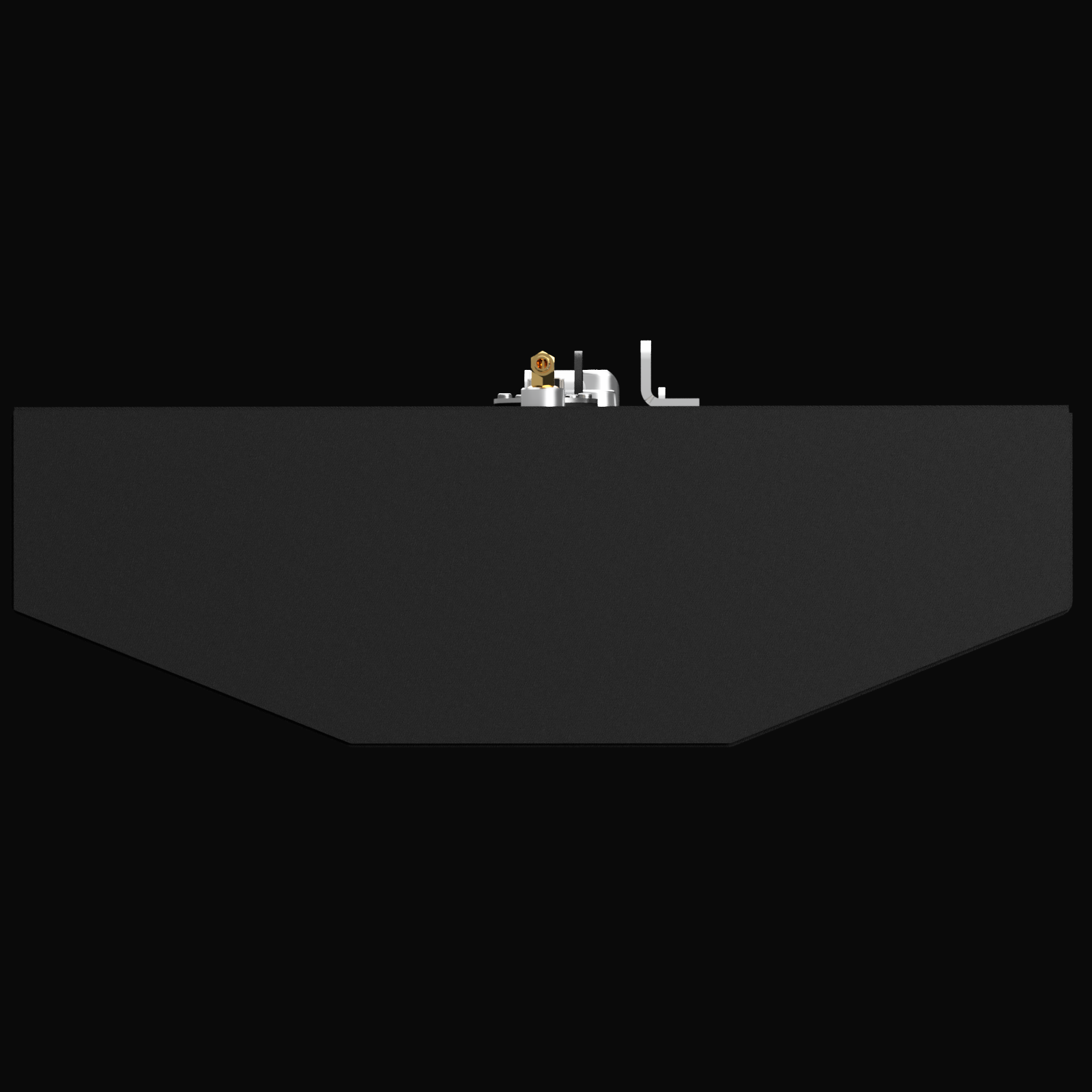 A steep top-down 3D rendering of a long, black rectangular fuel tank on a black background. It shows a large fitting cluster near the back, a small fitting cluster near the front with an L-bracket, and a separate L-bracket in the center."