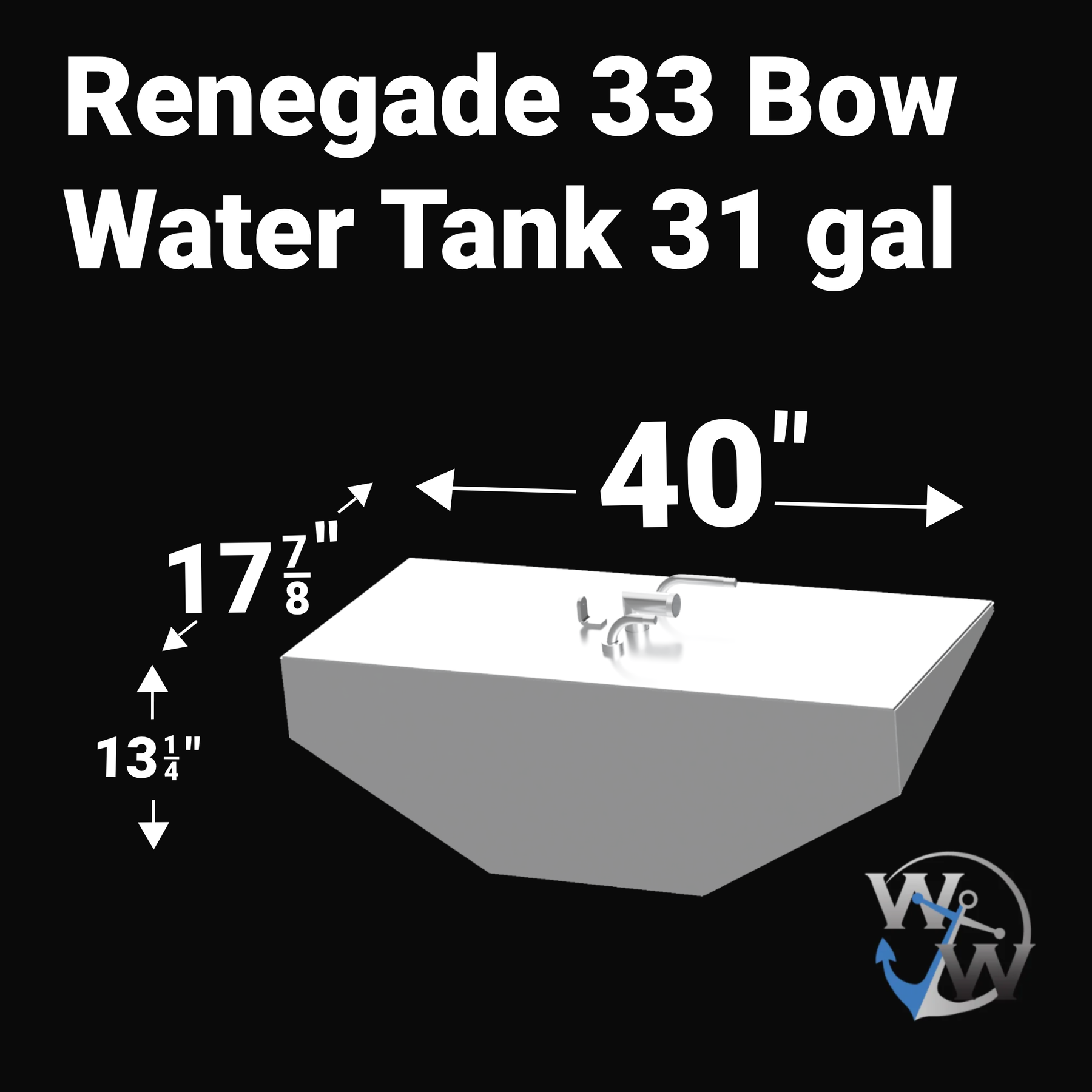 A diagram of a trapezoidal, silvery-gray boat water tank labeled "Renegade 33 Bow Water Tank 31 gal." The overall length is 40 inches. The height is $13 \frac{1}{4}$ inches, and the width or depth is $17 \frac{7}{8}$ inches. The tank has sloped sides and a fitting centered on the top surface. The logo "W&W" with an anchor is in the bottom right corner.