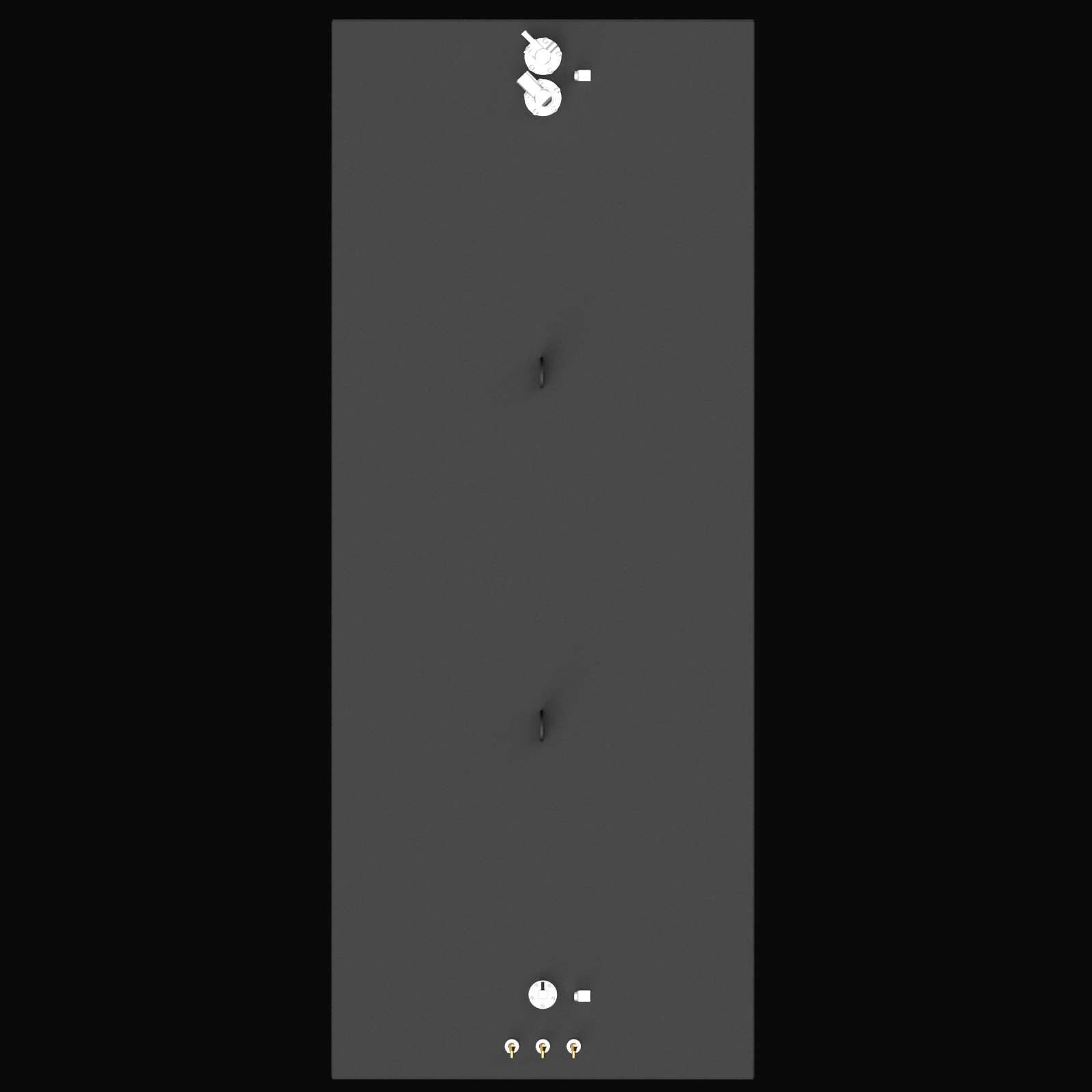 A top-down view of a long, dark gray rectangular object, likely a fluid tank. There are two oblong indentations running vertically down the center. Near the top edge, there are two circular white fittings and one small white square fitting. Near the bottom edge, there is one large circular white fitting, one small white square fitting, and three small circular gold/brass fittings arranged horizontally.