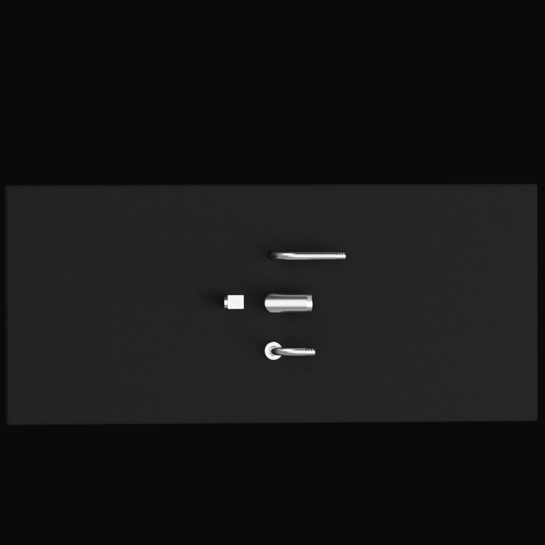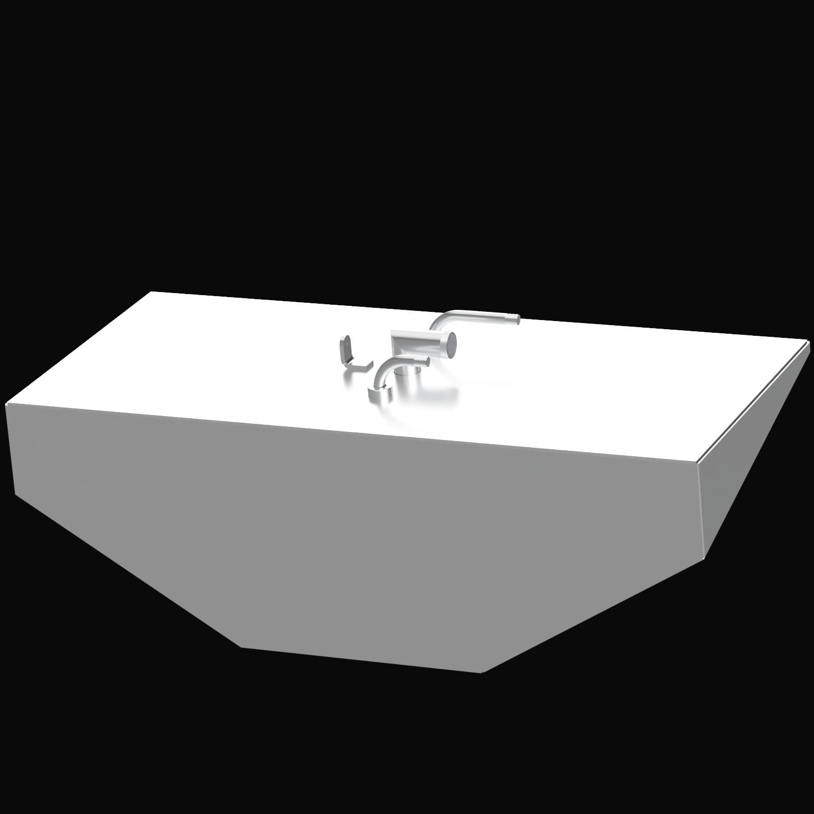 A 3D rendering of a square, dark gray or black rectangular tank, possibly a holding tank, set against a black background. Three silver or chrome-colored pipe fittings protrude from the center of the top surface. From left to right, the fittings are: one L-shaped, upright fitting; one short, curved fitting; and one taller, curved fitting.A 3D rendering of a square, dark gray or black rectangular tank, possibly a holding tank, set against a black background. Three silver or chrome-colored pipe fittings protru