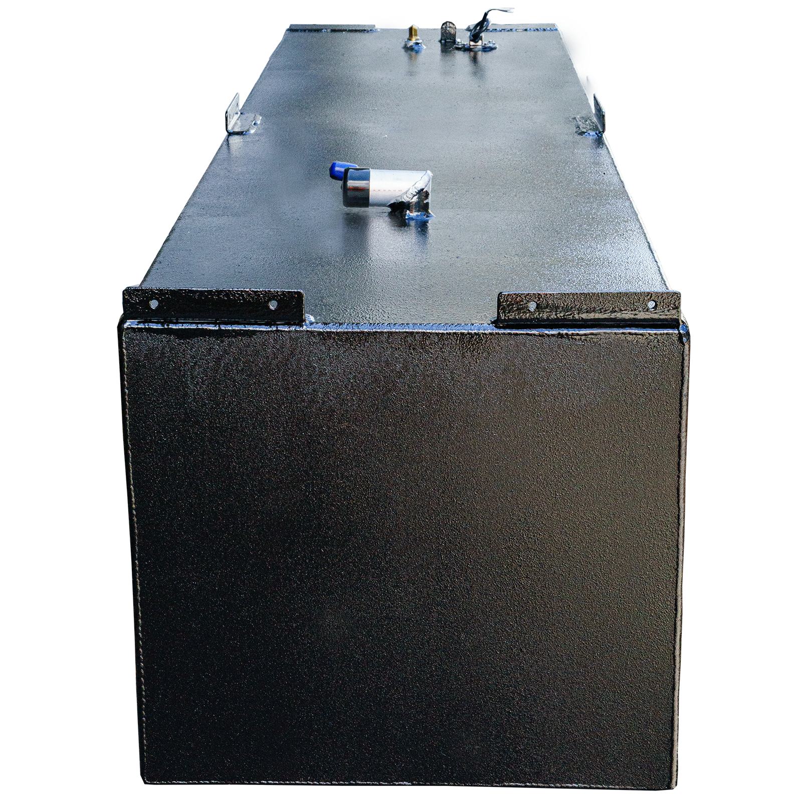 OEM replacement belly fuel tank for Mako 21' boat, featuring a sleek black design and a capacity of 125 gallons, with multiple fittings on top